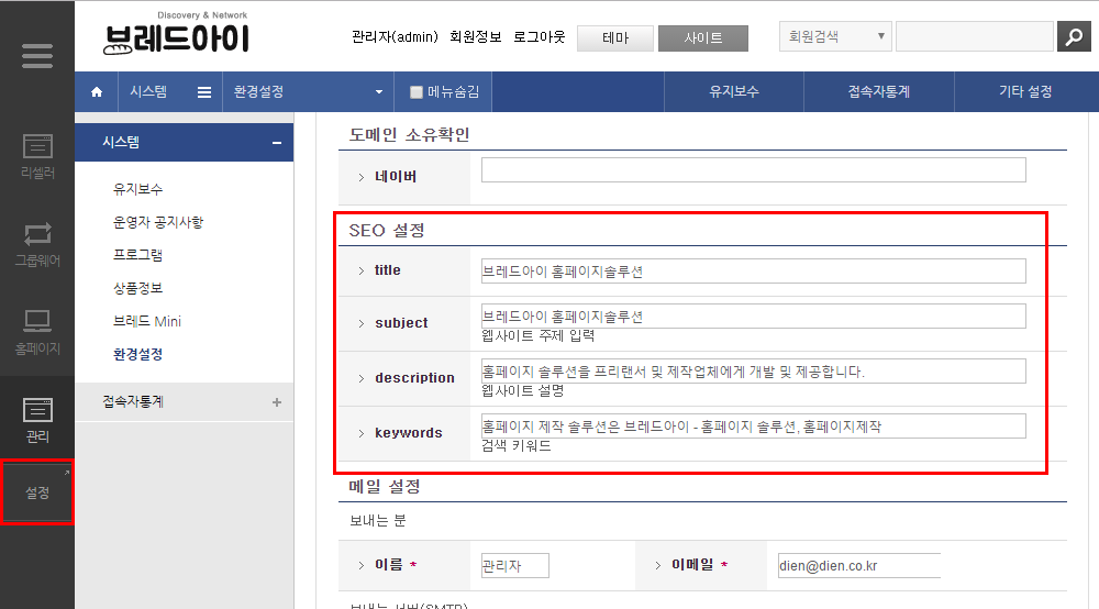 그리고 사이트이름, title. subject, description, keywords를 입력하신 후 저장해주시면 됩니다.