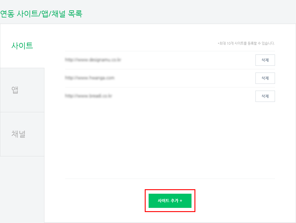 사이트 추가 버튼을 클릭 하여 사이트 등록을 진행합니다.
