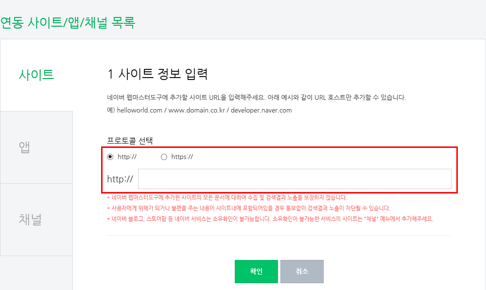 등록하고 싶은 도메인을 입력 후 확인을 클릭합니다.