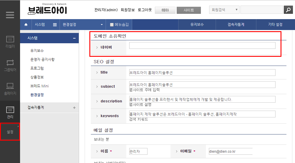 브레드아이를 쓰고 계신 고객님들 께서는 메타 태그를 복사하시어 관리자 설정에 넣으신 후 저장 버튼 누르시면 됩니다.